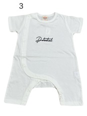 胸に刺繍でロゴが入り、やわらかな綿素材で、敏感な赤ちゃんの肌にもやさしくフィットします。股下はスナップボタン仕様で、お着替えやおむつ替えもラクラク。70サイズと80サイズをご用意しているので、成長に合わせて長くご愛用いただけます。