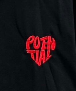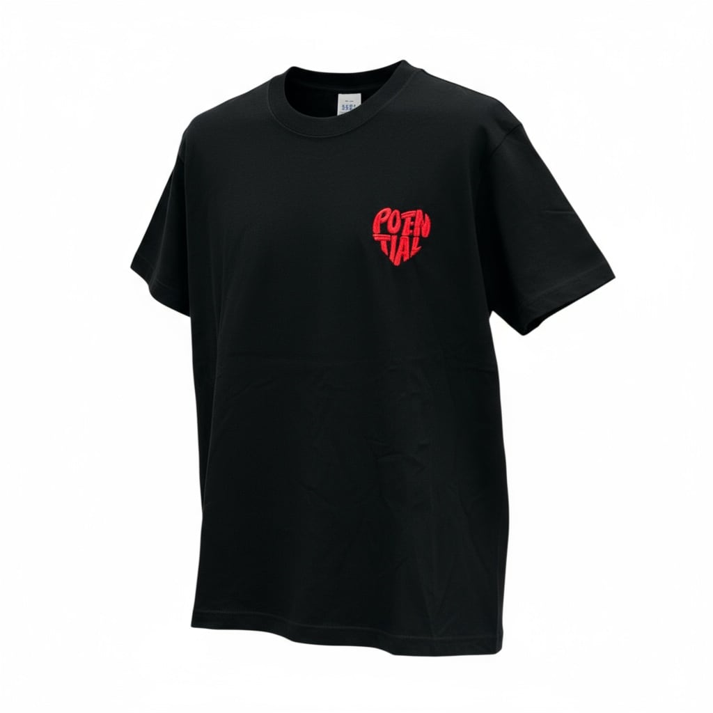 シンプルなブラックTシャツに、胸元のワンポイントとしてハート型の「POTENTIAL」刺繍が映える一枚です。