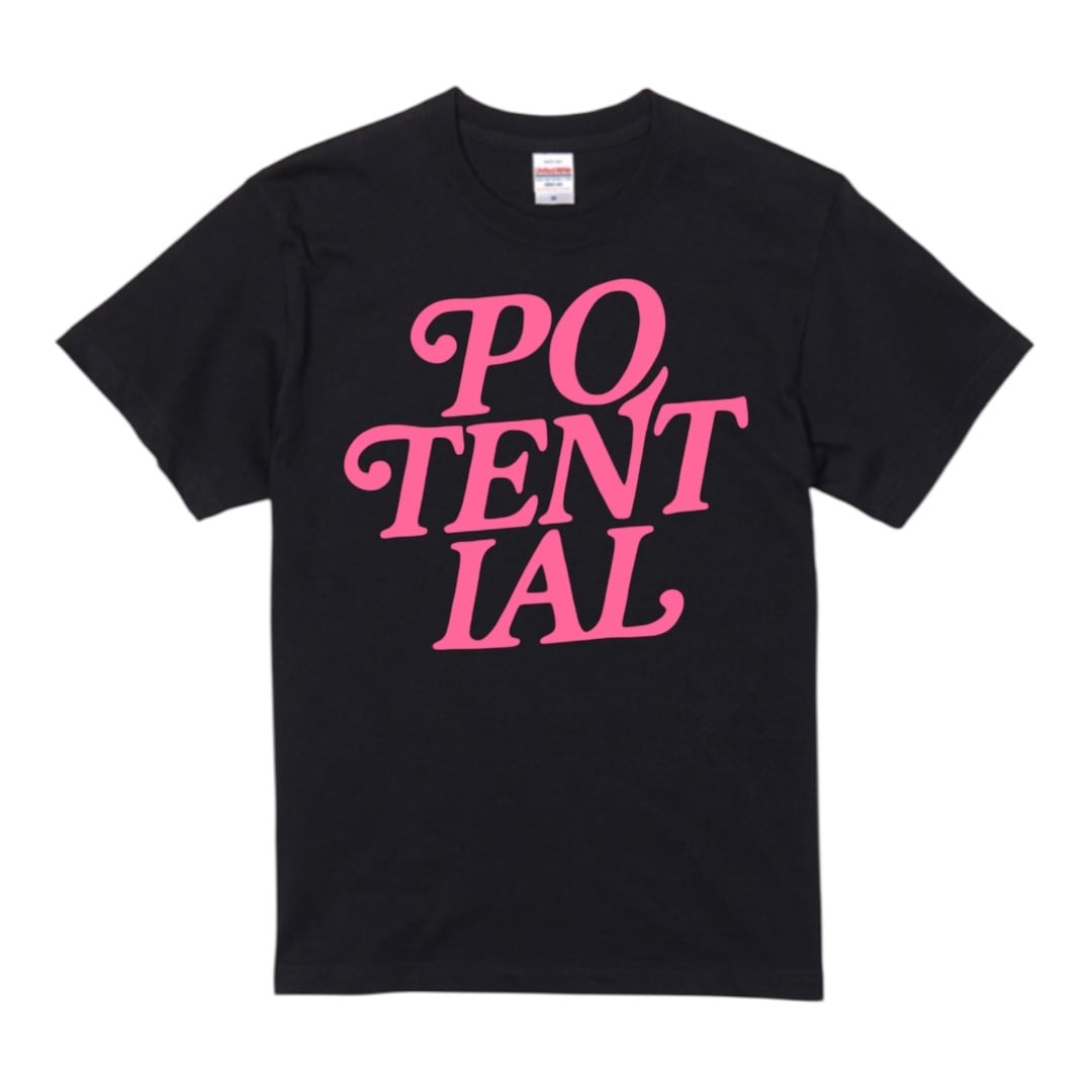 POTENTIALのNEWロゴが施されたシンプルなブラックTシャツ。胸元に映える赤のロゴがスタイリッシュなアクセントとなり、カジュアルでありながら個性的な印象を与えます。ユニセックスでどなたでも気軽に楽しめるデザインで、デイリーコーデやお出かけスタイルにも最適です。柔らかく着心地の良いコットン素材で、快適な着用感を実現しました。