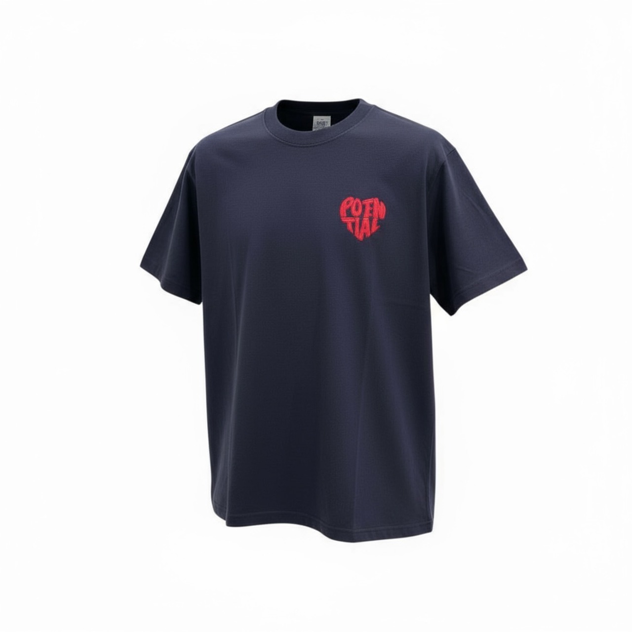 シンプルなネイビーTシャツに、胸元のワンポイントとしてハート型の「POTENTIAL」刺繍が映える一枚です。