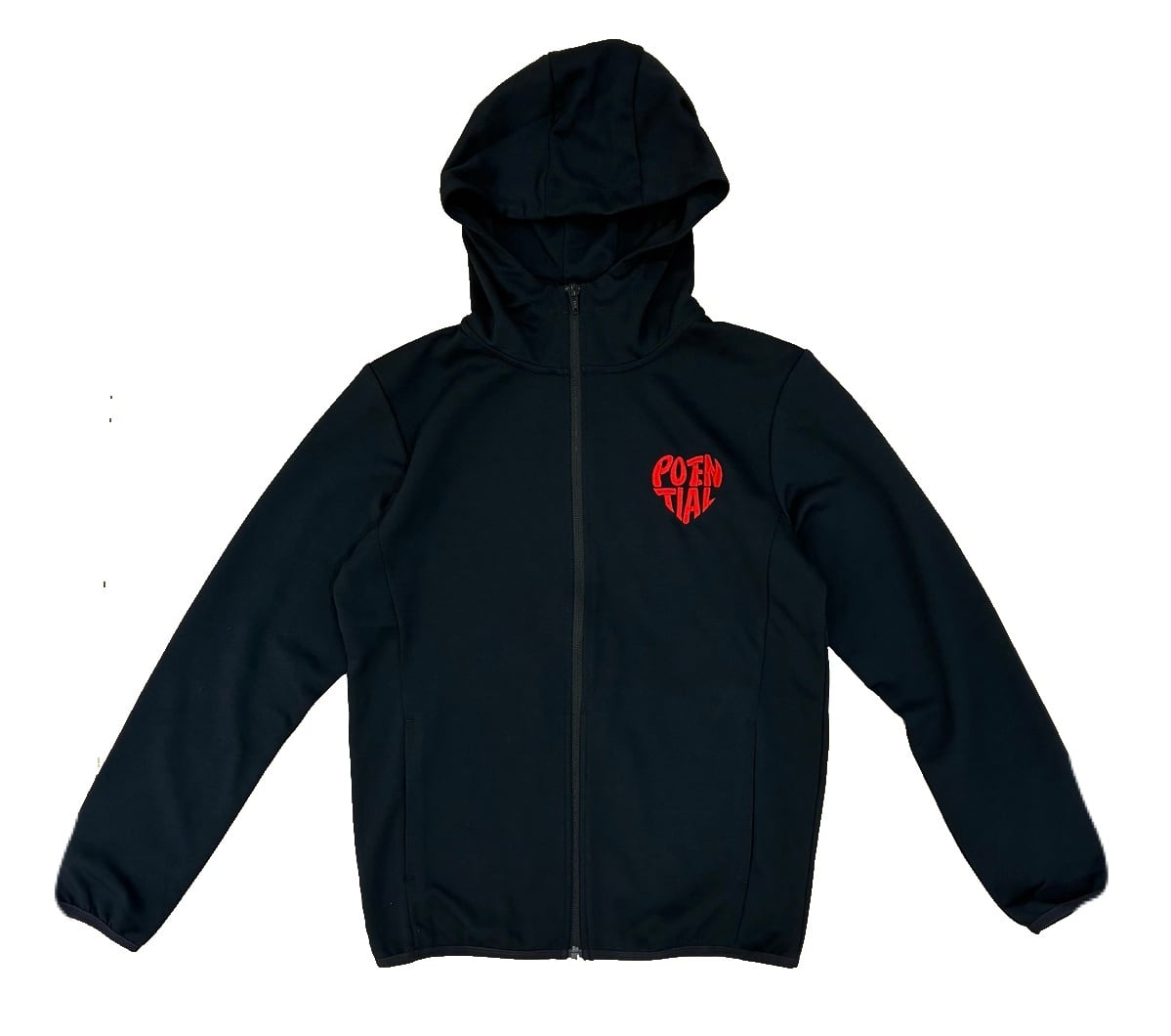 POTENTIALのハート刺繍がかわいらしい印象を与えるブラックパーカー。ドライ生地を使用しているため、汗をかいても快適な着心地を保ちます。ストレッチも効いており、普段着はもちろん、アクティブなシーンでも活躍するアイテムです。シンプルなデザインながら、さりげないハートの刺繍がポイントになり、コーディネートに華やかさをプラスします。