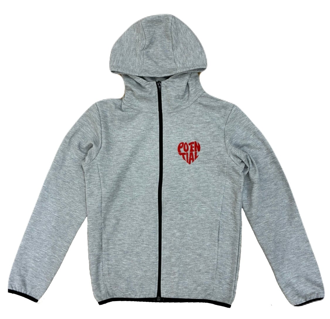 POTENTIALのハート刺繍がかわいらしい印象を与えるグレーパーカー。ドライ生地を使用しているため、汗をかいても快適な着心地を保ちます。ストレッチも効いており、普段着はもちろん、アクティブなシーンでも活躍するアイテムです。シンプルなデザインながら、さりげないハートの刺繍がポイントになり、コーディネートに華やかさをプラスします。