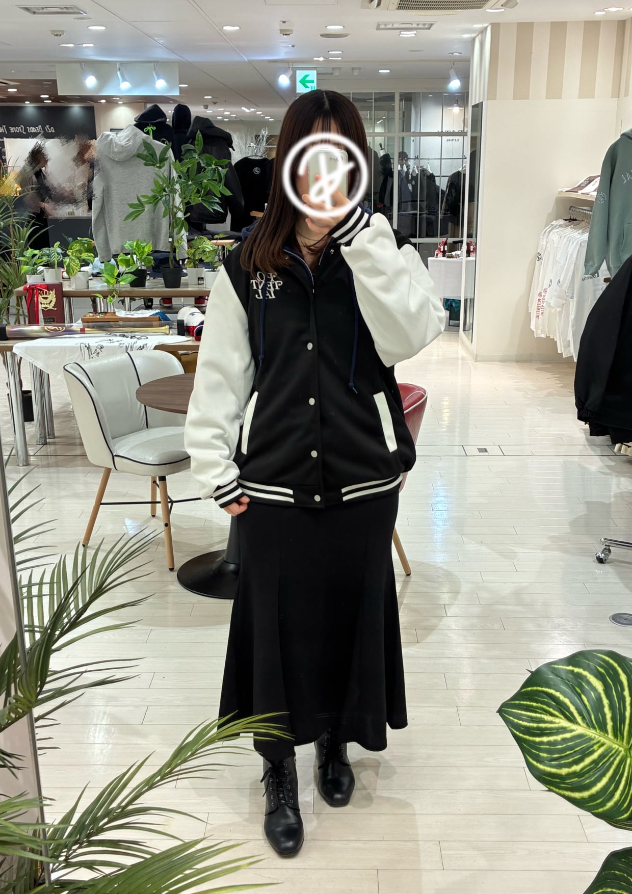 そのどちらのシーンにも自然に馴染む ベースボールジャケット(スタジャン風)。