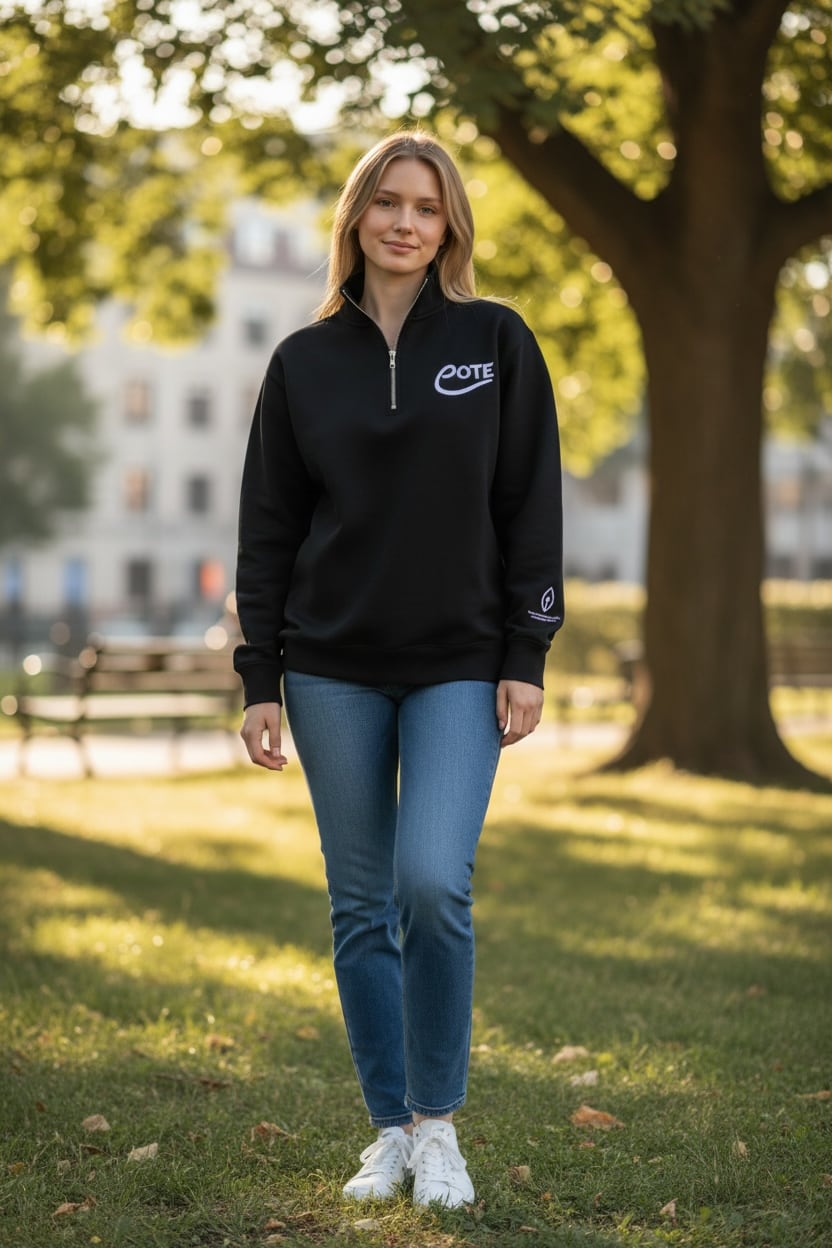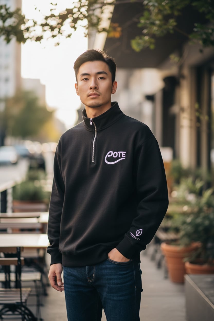 シンプルながらスタイリッシュなハーフジップデザインが魅力的。