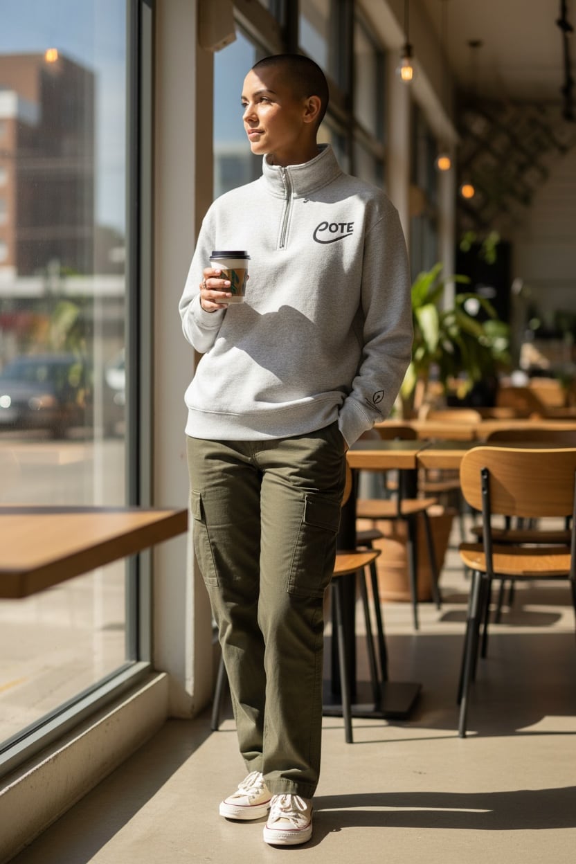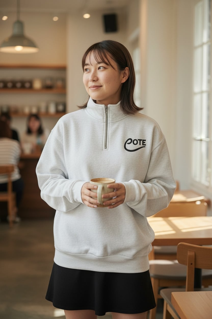 シンプルながらスタイリッシュなハーフジップデザインが魅力的。