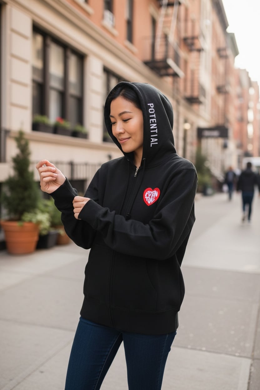 フードにはスタイリッシュなPOTENTIALの文字がプリントされ、