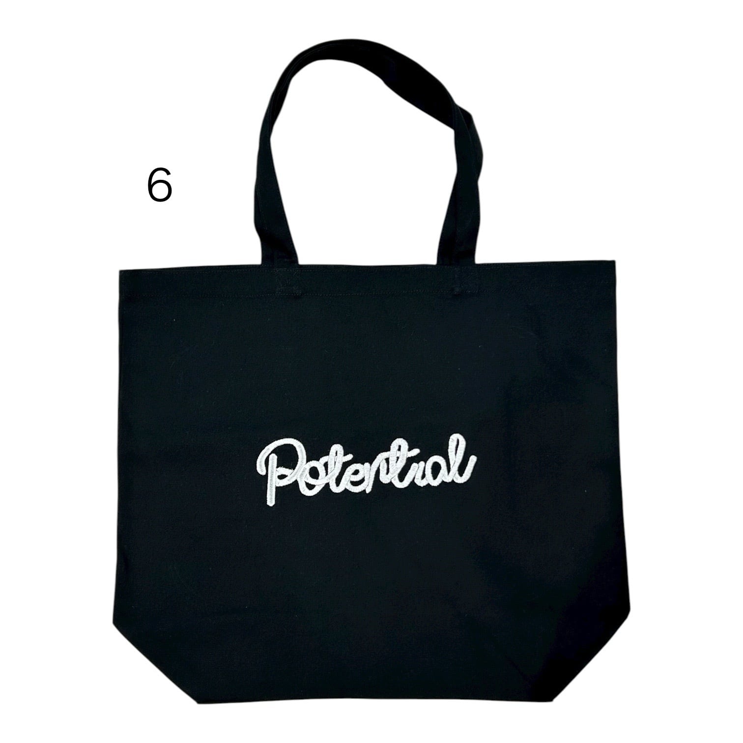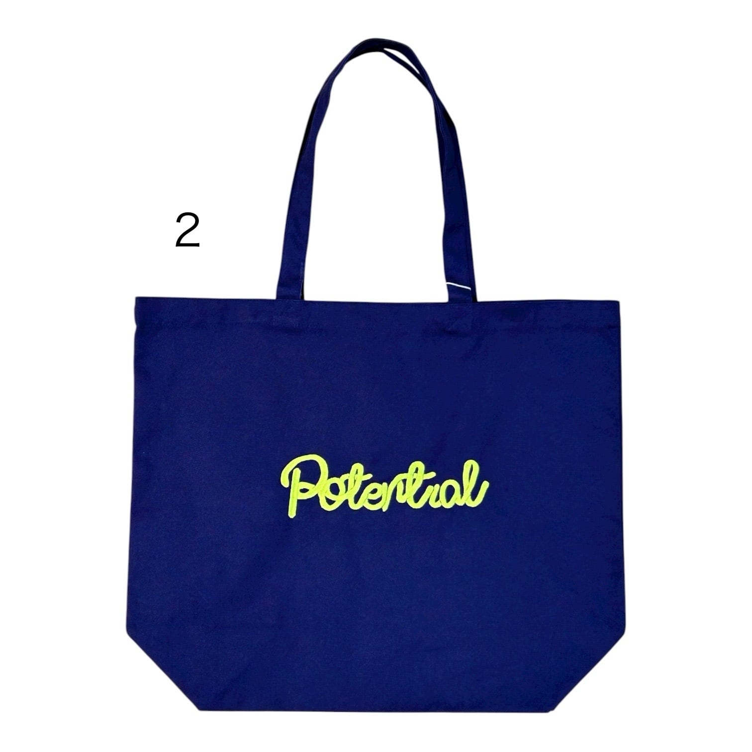 人気のトートバッグにPOTENTIAL筆記体ロゴを両面に大きく配置したトートバッグ